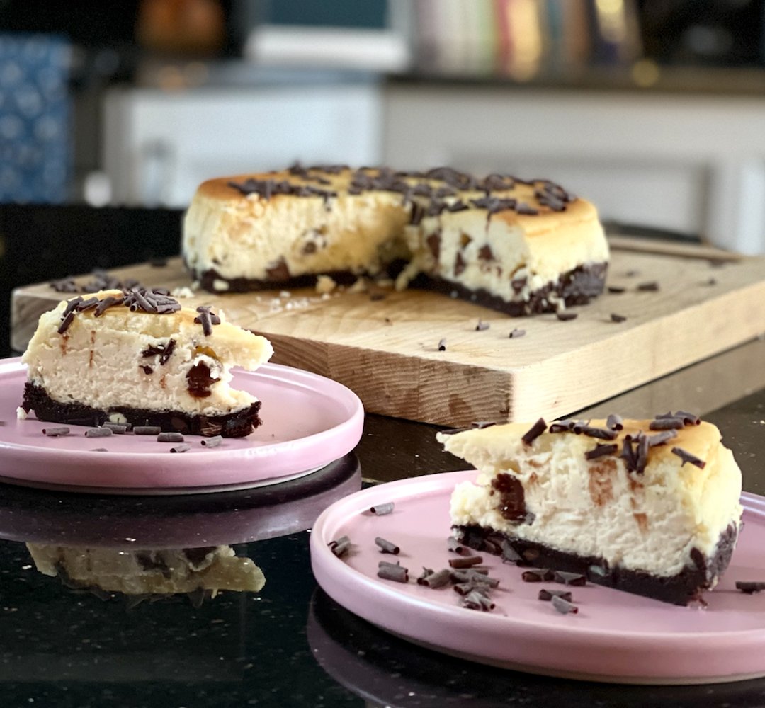 To ensure that the base remains solid and doesn’t burn, first wrap the outside of the bottom of your tin in tinfoil to create a waterproof cover. It needs to be higher than the top of the cheesecake base to prevent any water getting in when you do the next steps. Then place the cheesecake tin in a larger roasting/ baking tin sheet. Carefully pour some water into the larger tin, so it’s approximately the same height as the cookie base, try not to splash the cheesecake. Place into the oven to bake for 50-60 minutes or until the top is golden brown and the cheesecake loses it’s wobble